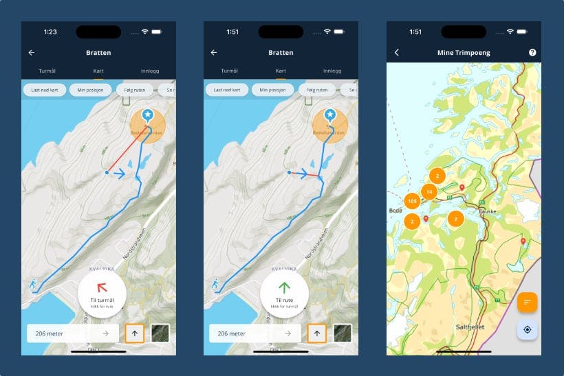 I den siste versjonen av Trimpoeng-appen har vi lagt til to nye funksjoner: Se retningen din i kartet og «Mine Trimpoeng» – et kart som viser alle dine innsjekkinger.